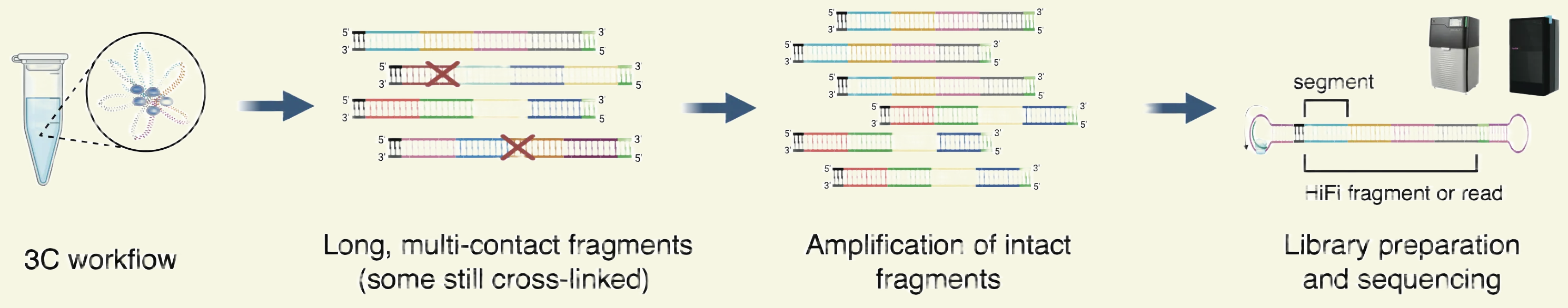 Step 3: The long HiFi concatemers are split in silico at restriction sites into multiple interacting segments, which are converted into chromatin contacts for downstream 3D genome analyses.